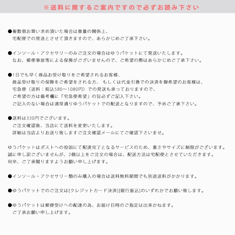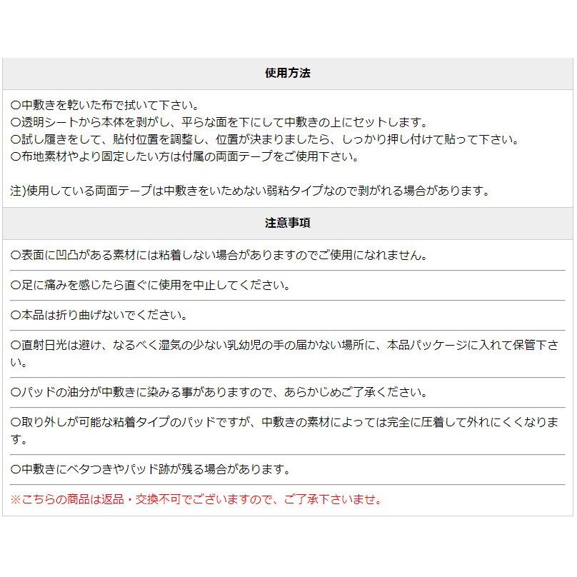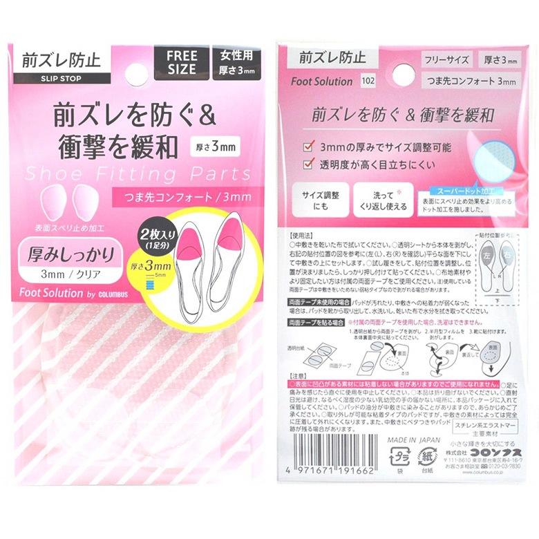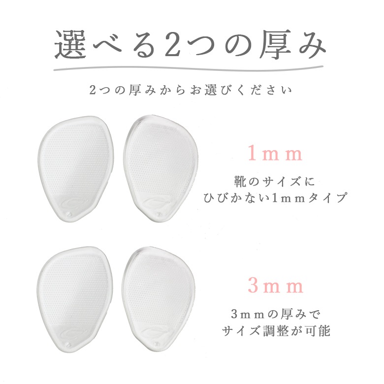 | せっかく気に入ったデザインの靴を買っても、 甲が薄くて、靴が足にフィットしていないと、足が前滑りしてつま先が痛い・・・ そんな方の悩みを解決してくれるのがコレ!! クリアタイプだから、靴を脱いでも目立たないのがいいですね。 クッション性に優れているので、足の疲れも和らげます。 スベリ止め防止効果をより高めるスーパードット加工付き。 粘着式で、繰り返し使えるのも嬉しいポイント。 お手持ちの靴が、より快適に。 1つあると重宝するアイテムです。 【厚さ】:1mm/3mm 【素材】:スチレン系エラストマー ※こちらの商品は返品・交換不可でございますので、ご了承下さいませ。 |