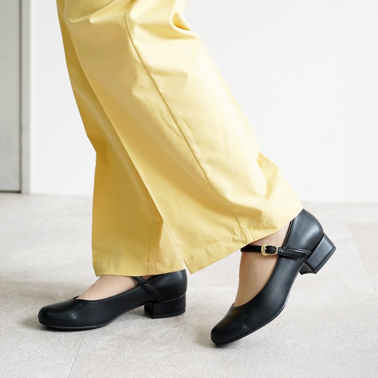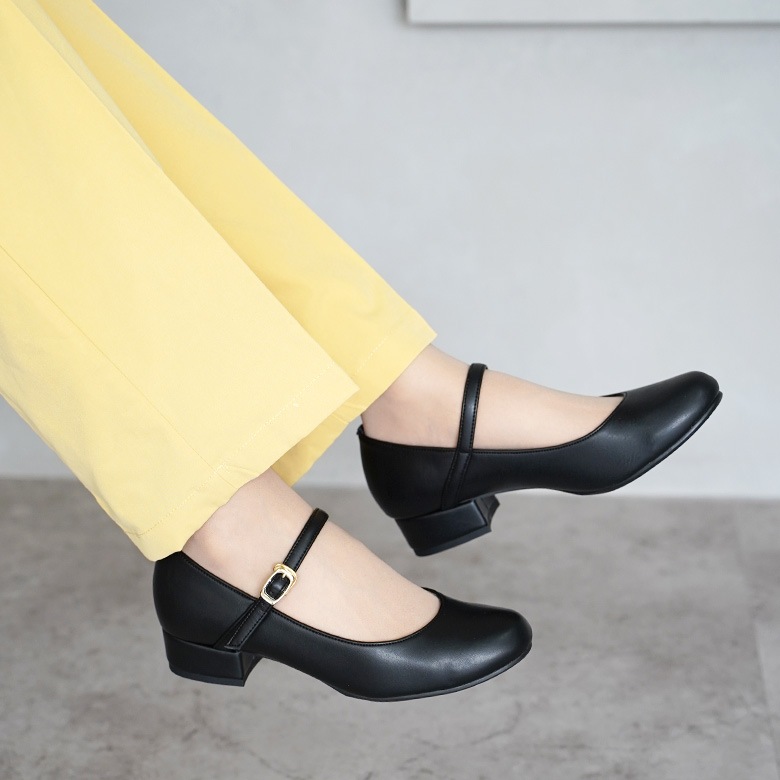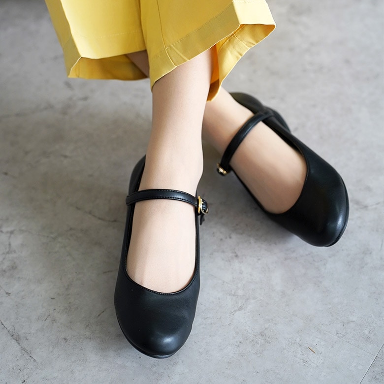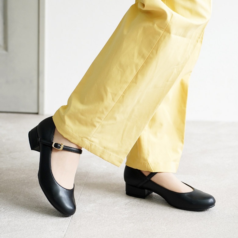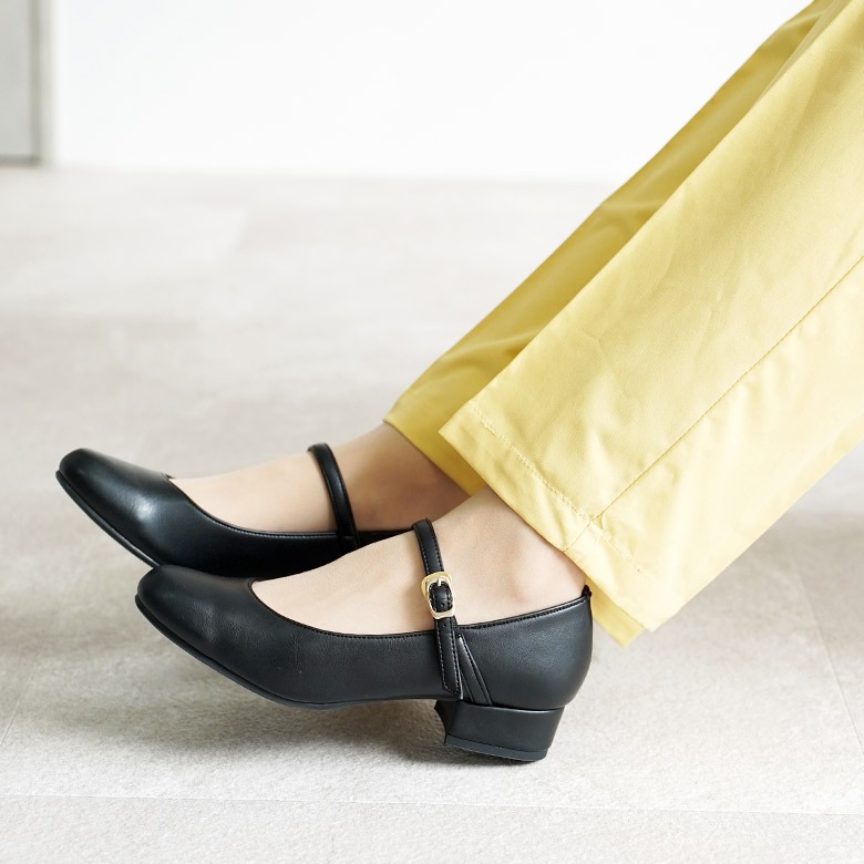 ベルト付きの太ヒールのラウンドパンプスです。