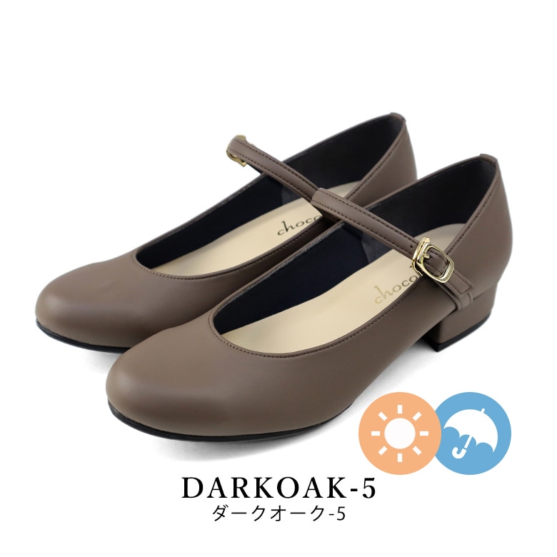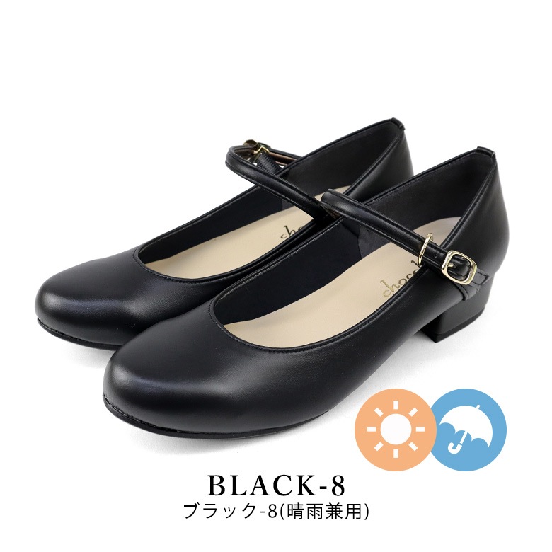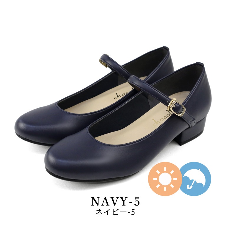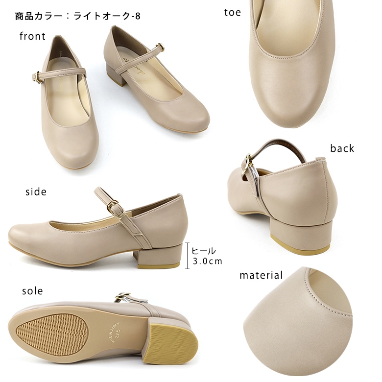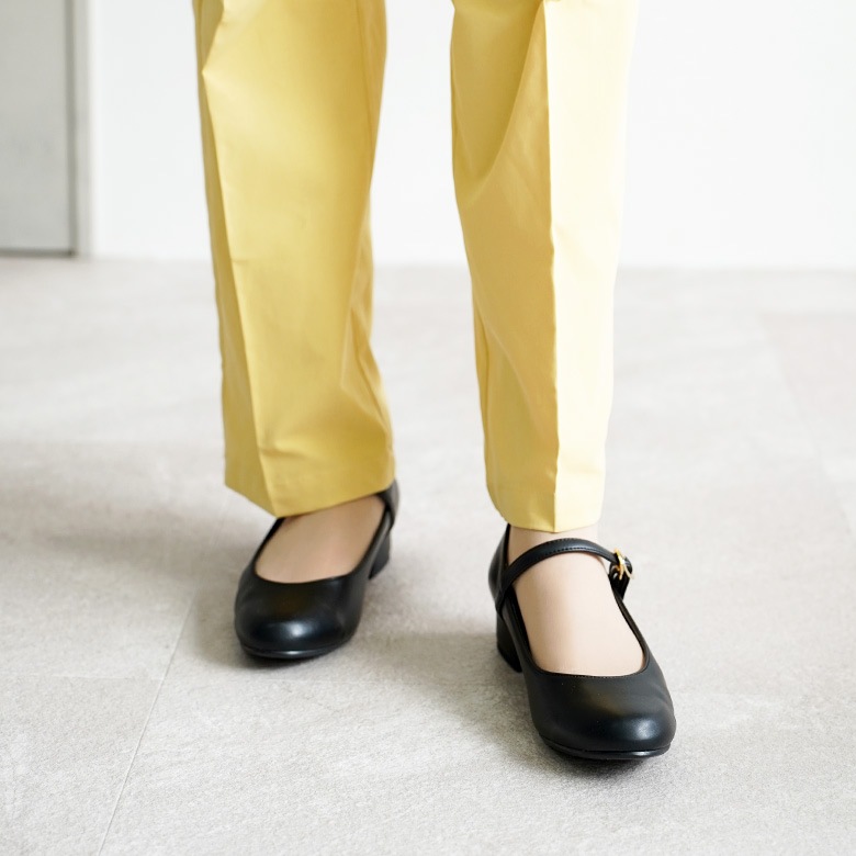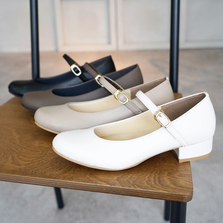 ベルト付きの太ヒールのラウンドパンプスです。