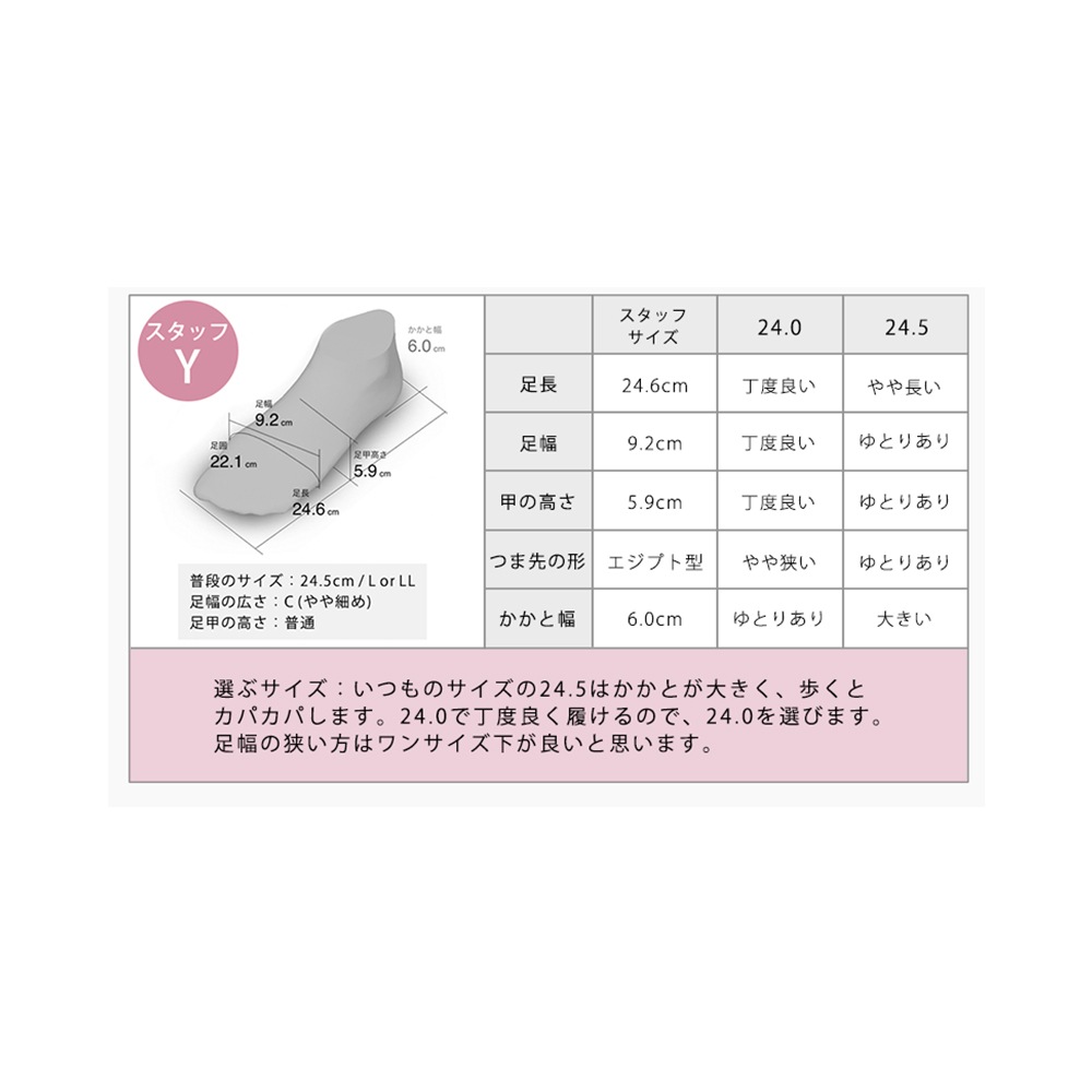 普段24.5cmのスタッフが履いたところ、24.0cmでぴったりでした。