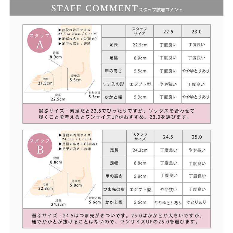 ※靴下を着用される方、普通~幅広の方はワンサイズアップがおすすめです。