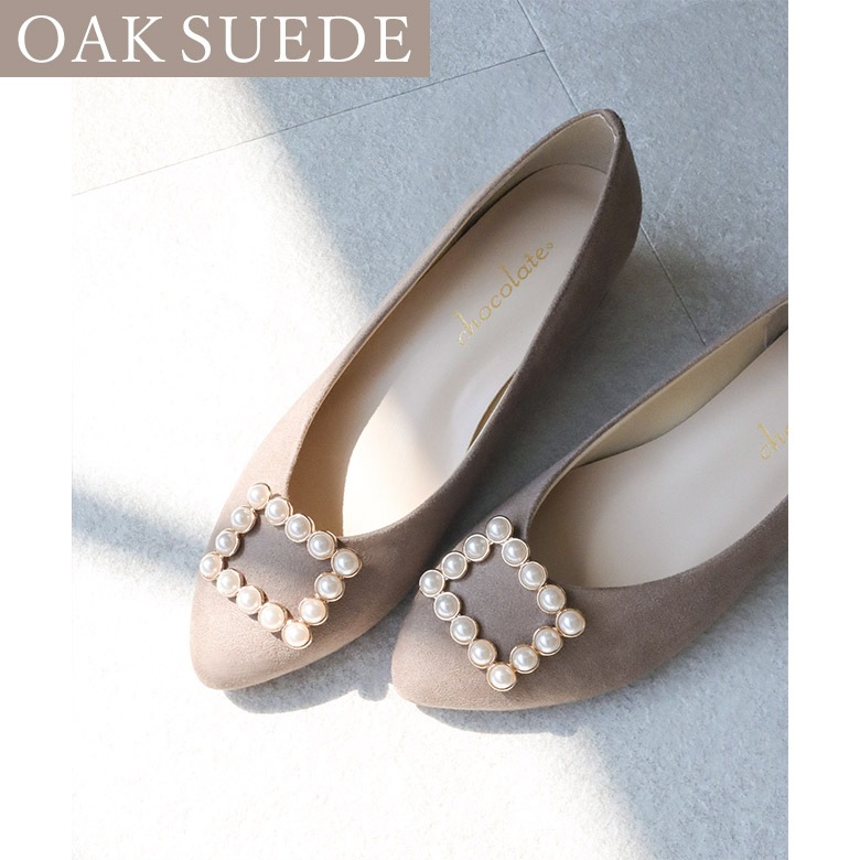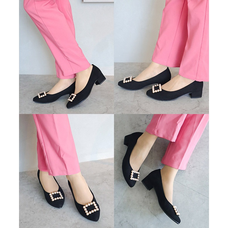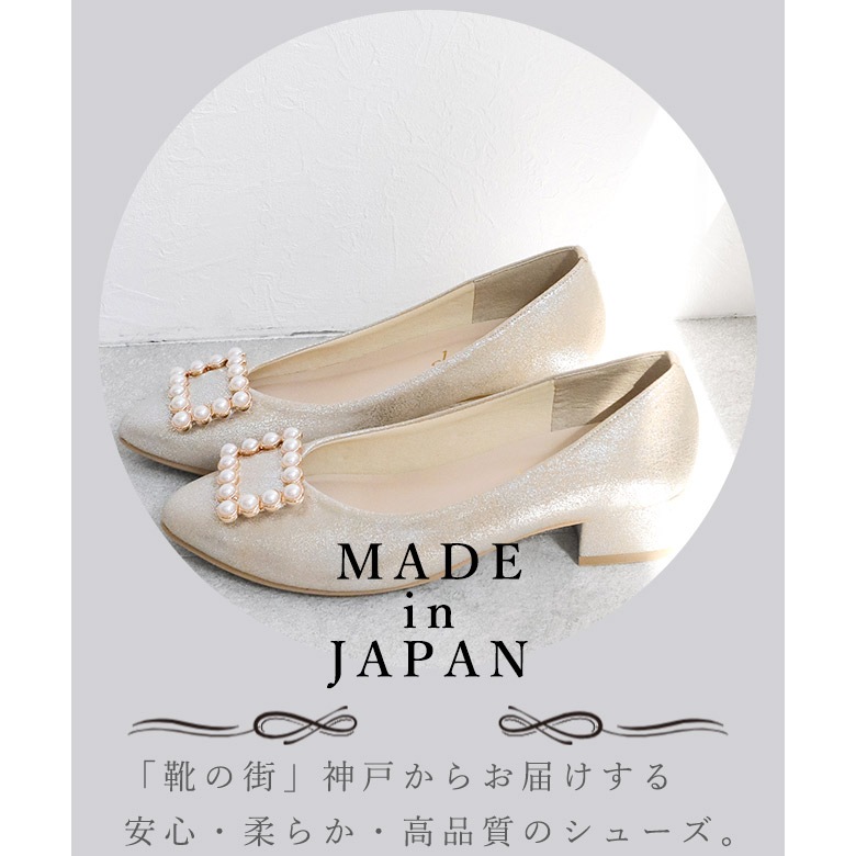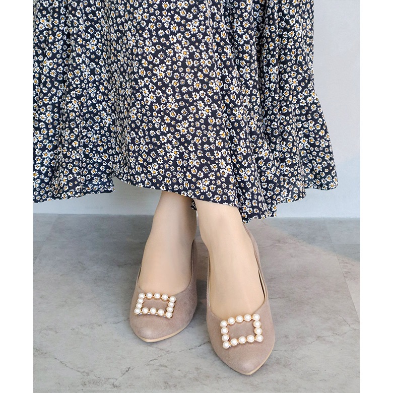 大人気のアーモンドトゥの木型で作成したパールのバックル付きパンプスです。