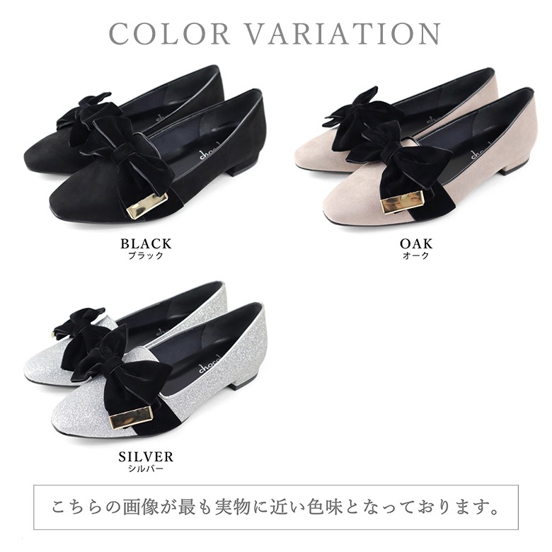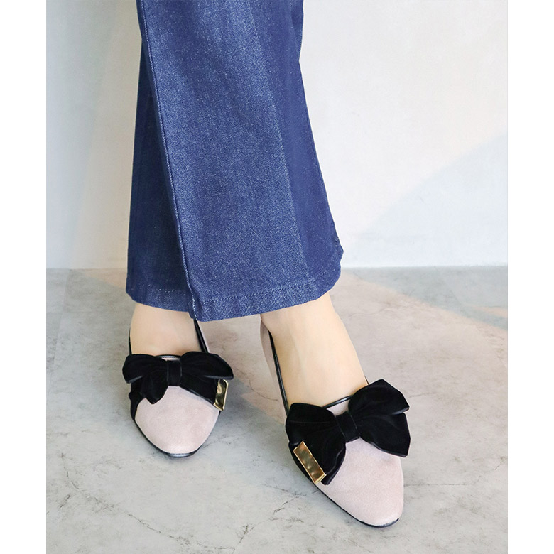 甲にベルベットのふんわりリボンが付いた豪華なパンプスです。