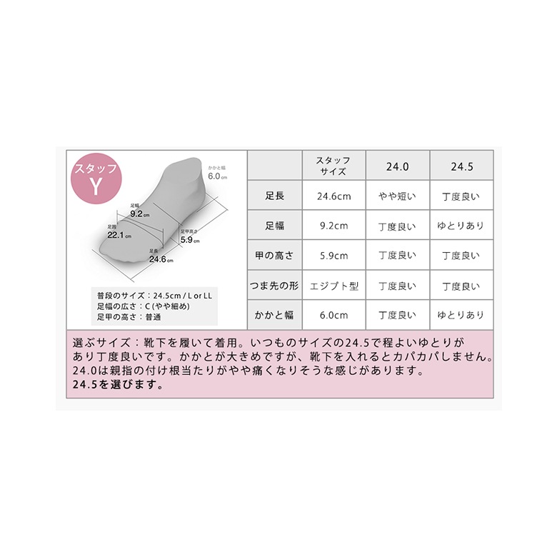 普段24.5cmのスタッフが履いたところ、24.5cmで丁度良いサイズ感でした。